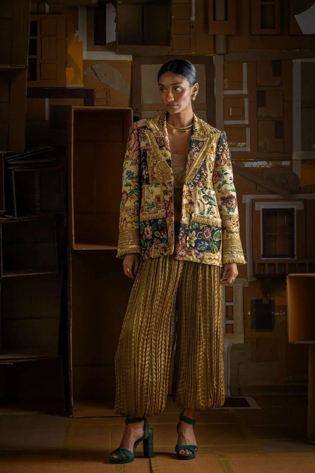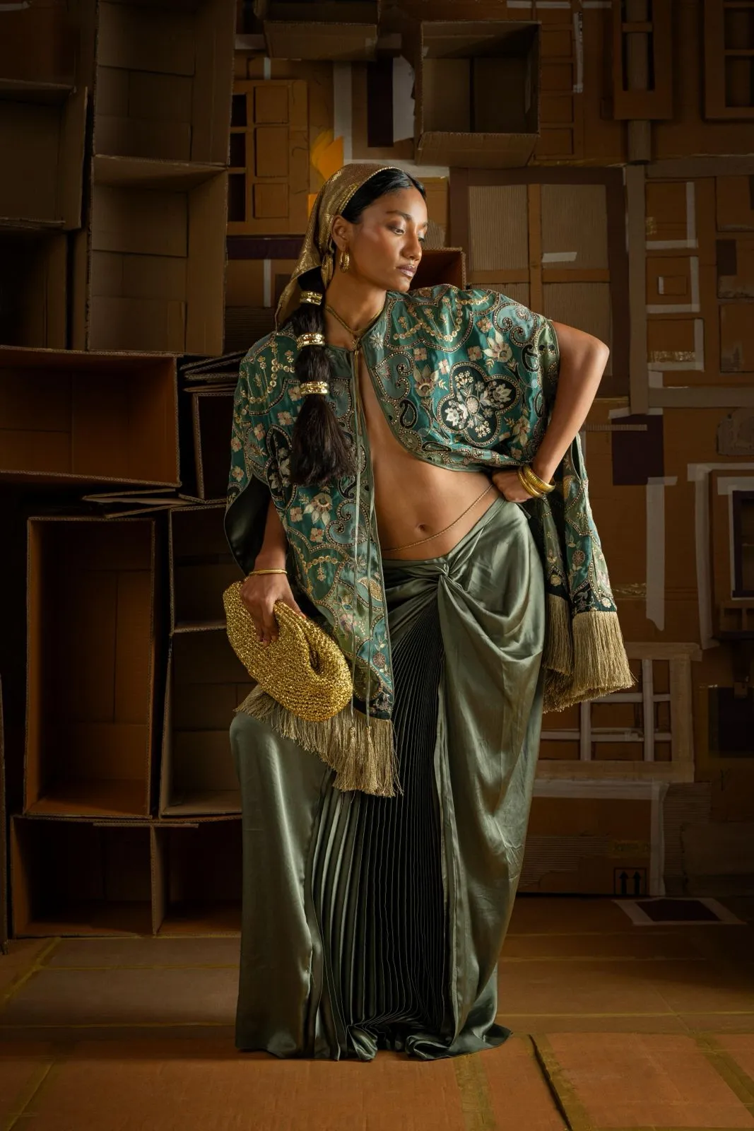 This collection explores contrasts — mirror work meets minimalism, soft drapes meet sharp tailoring.